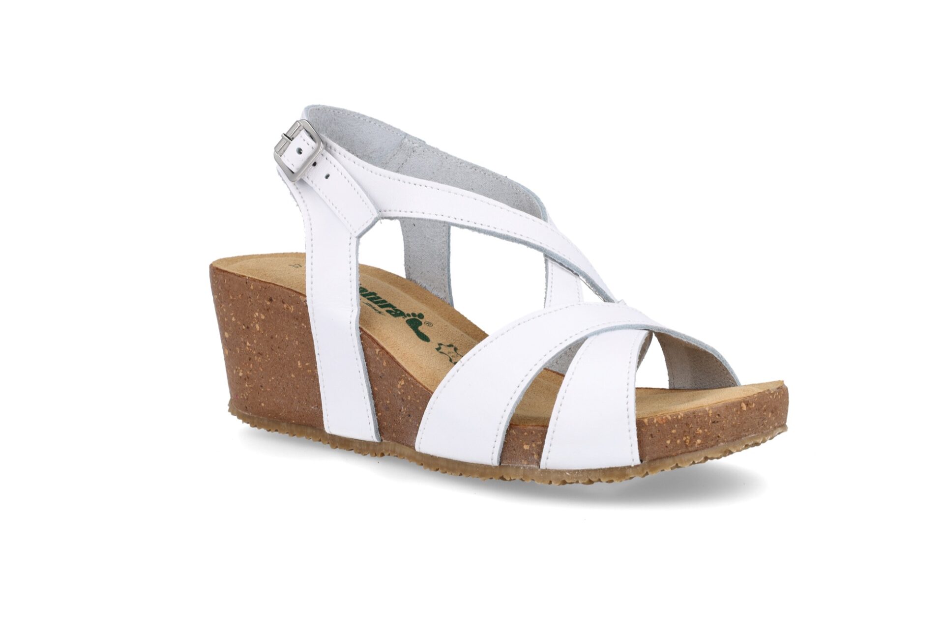 La tomaia è intrecciata in vera pelle e grazie al cinturino intorno alla caviglia, è perfettamente adattabile ad ogni tipologia di piede.